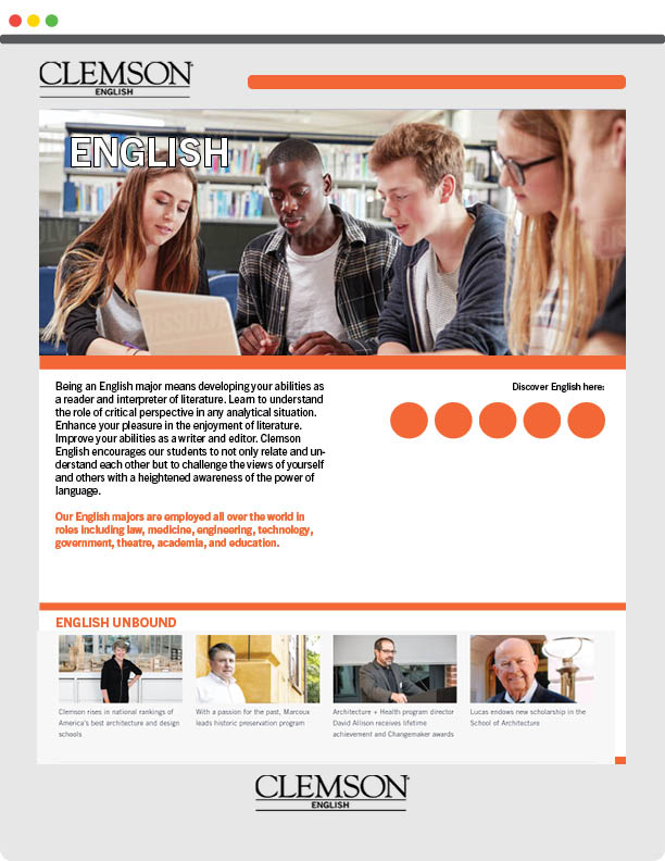 I also created a new homepage layout in this stage. Following the Clemson recommended color guidelines, I created wireframes of what the new site color scheme would like like. We found the contrast between the orange and "innovation" (gray) to be a better fit to be eye-catching to prospective students. Also at this stage, I recommended to the department that they include the "English Unbound" student run blog on the homepage.